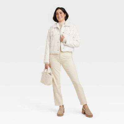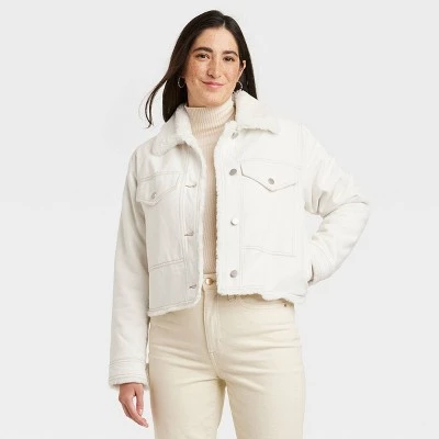 Rock the perfect blend of cozy and stylish with this Faux Fur-Lined Trucker Jacket from Universal Thread™. This white trucker jacket is made of heavyweight twill cotton and full faux-fur lining for toasty warmth, and there are hints of the fuzzy lining visible at the waist, front placket, collar, and sleeve openings for visual interest. The long-sleeve jacket is styled with a full-length button-down front, roomy patch pockets on the chest with buttoned flaps and stitched detailing and is tailored in a casual, below-waist fit for versatile wear.